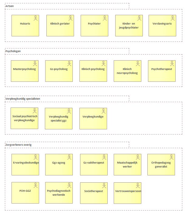 Vanuit de bron "Zo werkt de GGZ" een lijst met soorten zorgverleners , werkzaam binnen of met de GGZ.<br/><br/>Zorgverleners hebben informatie nodig om hun bedrijfsactiviteiten uit te voeren. Soms is deze informatie intern beschikbaar, maar vaak zijn zij afhankelijk van een keten- of netwerkpartner. Omgekeerd komt het regelmatig voor dat een keten- of netwerkpartner informatie nodig heeft van een zorgverlener.<br/>